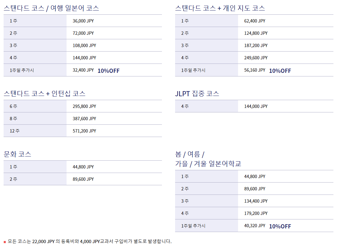 - 문화 코스: 일본 문화에 관심 있는 학생들을 위한 코스로, 주당 2회의 전통 문화 수업이 포함되어 있습니다.